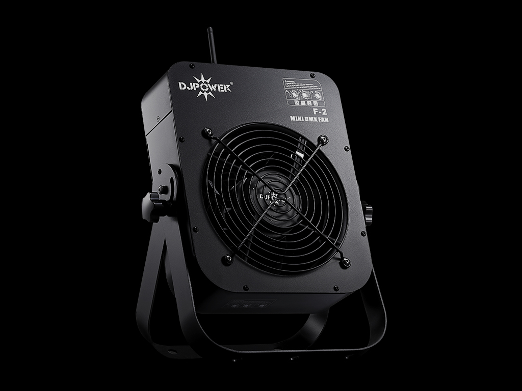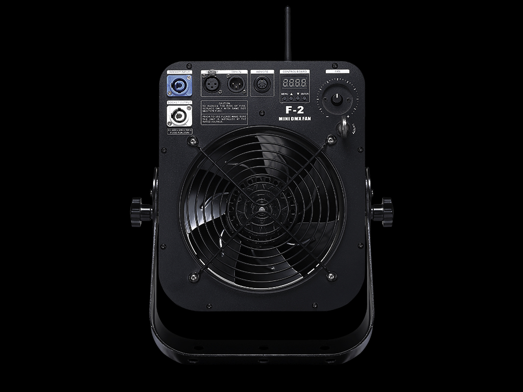 F-2 is a mini but all-purpose stage fanfeatures 4 control options, wired control, low power consumption, adjustableblowing directions, durable metal housing and compact size. In addition to thebuilt-in DMX control and the manual knob, wire and wireless controllers areoptional to cope with diverse needs. External antenna provides high-sensitivityremote control.